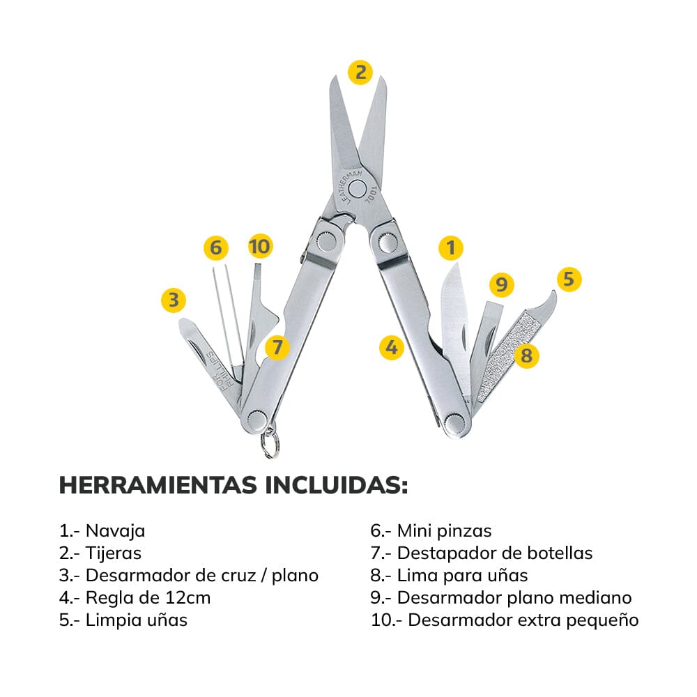 • Cuerpo y herramientas fabricados en Acero Inoxidable de uso rudo. • Tamaño compacto y ligero, ideal para usar en llavero o en el bolsillo. • Diseñado para un uso rudo y rendir por un largo tiempo . • Está hecha para realizar las tareas básicas con herramientas indispensables. • Tamaño cómodo para actividades del día a día. • Fabricada en acero inoxidable. |