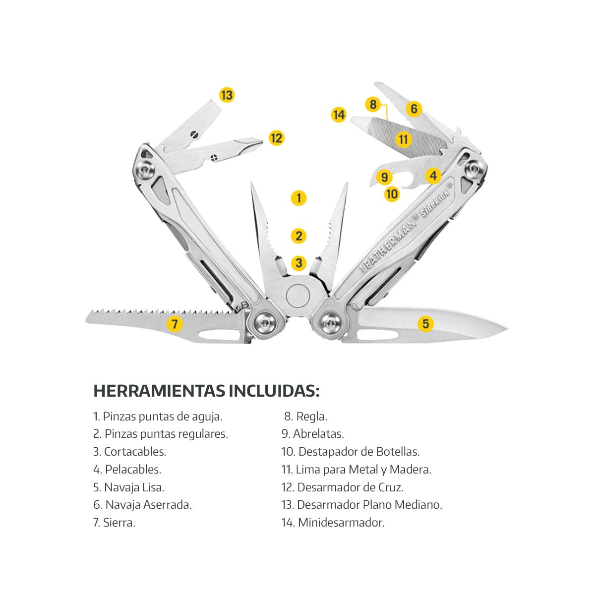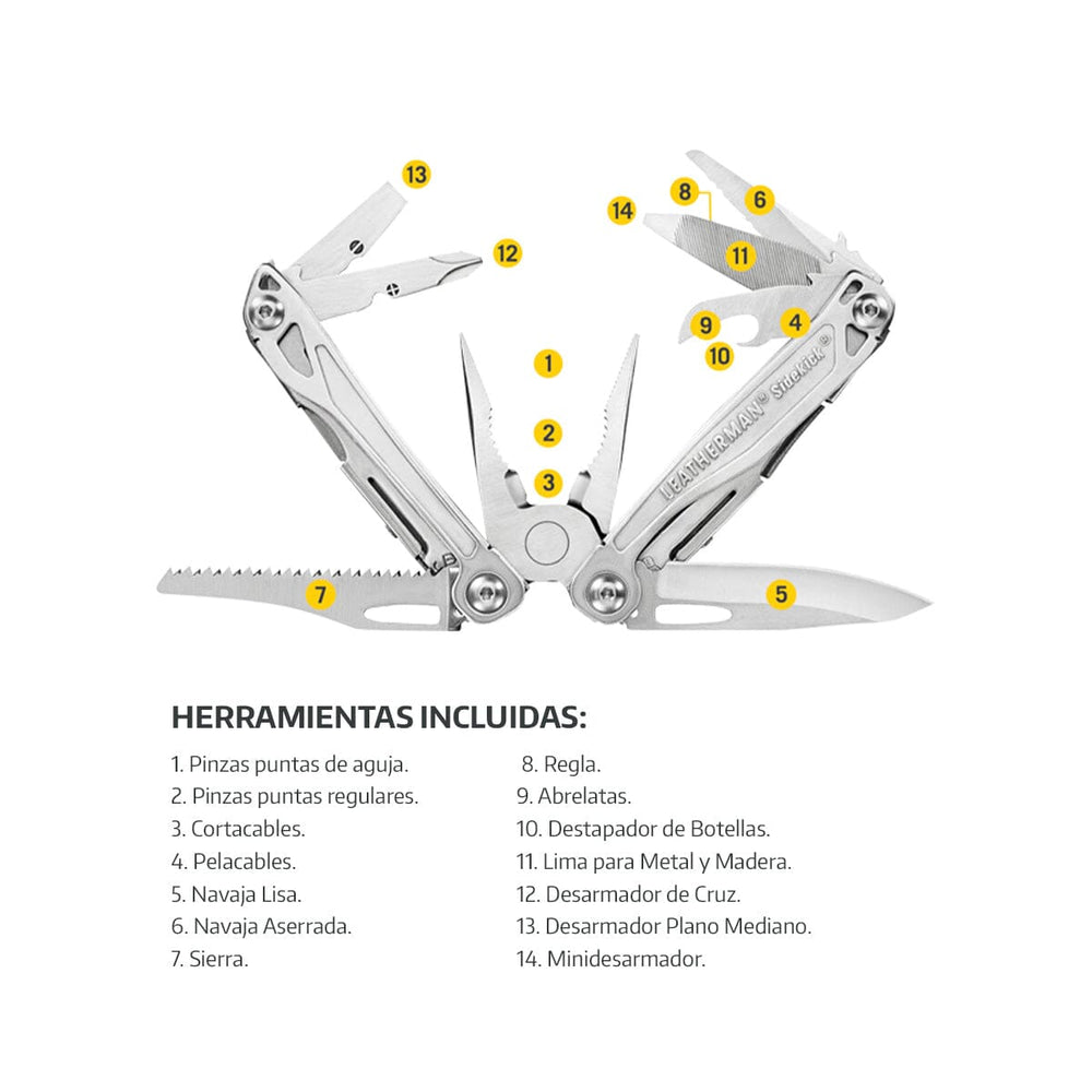 Multiherramienta con 14 Herramientas en una. Fabricada en Acero Inoxidable para un uso rudo. Tiene muelle de resorte, lo que facilita su operación con una mano. Tamaño cómodo para actividades del día a día. La variedad de herramientas incluidas solucionaran de forma inmediata un gran numero de trabajos tanto en el hogar como en el taller. Máxima calidad con 25 años de garantía. Incluye Funda.