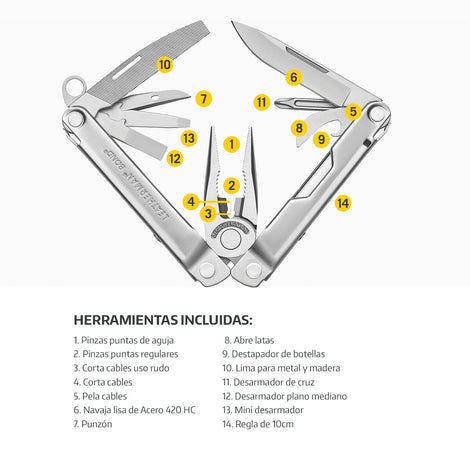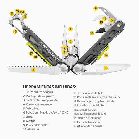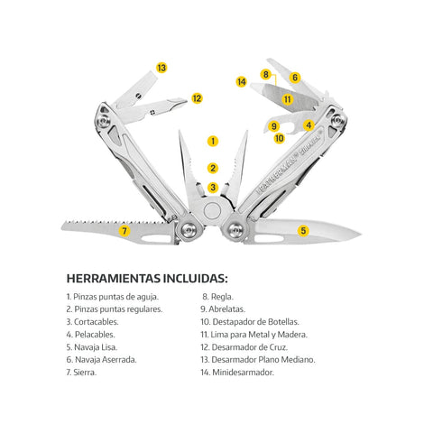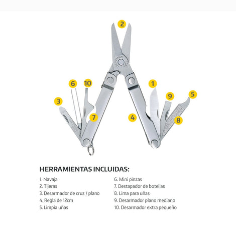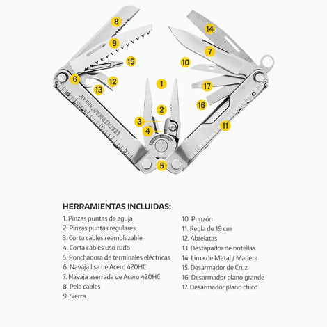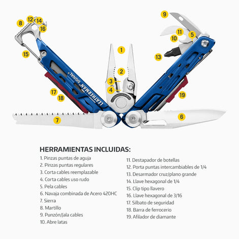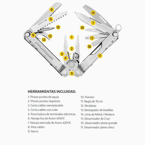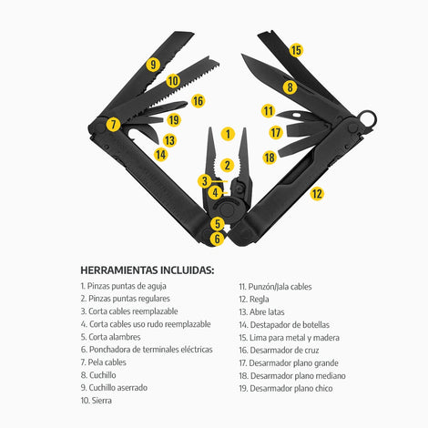 | Aplicación | Sin duda alguna es una de las Multiherramientas más solicitadas en el mercado, su excelente tamaño y la gran variedad de 18 herramientas incluidas, proporcionan una solución a un sin número de necesidades, ya sea en la casa, trabajo o actividades al aire libre. Incluye porta puntas hexagonales y corta cables reemplazable. | |
