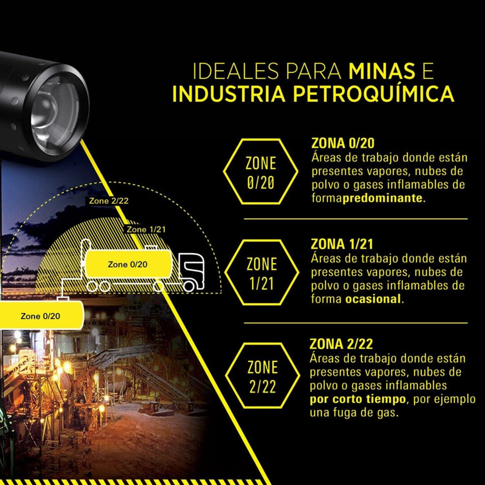 | Aplicaciones | • La línea EX cuenta con la certificación ATEX, lo que las hace intrínsecamente seguras, es decir, no producen chispa al encenderse o apagarse. Ésta característica permite utilizarlas en zonas de alto riesgo de explosión (2/22) como zonas donde haya vapores, gases, polvos o nubes inflamables. |