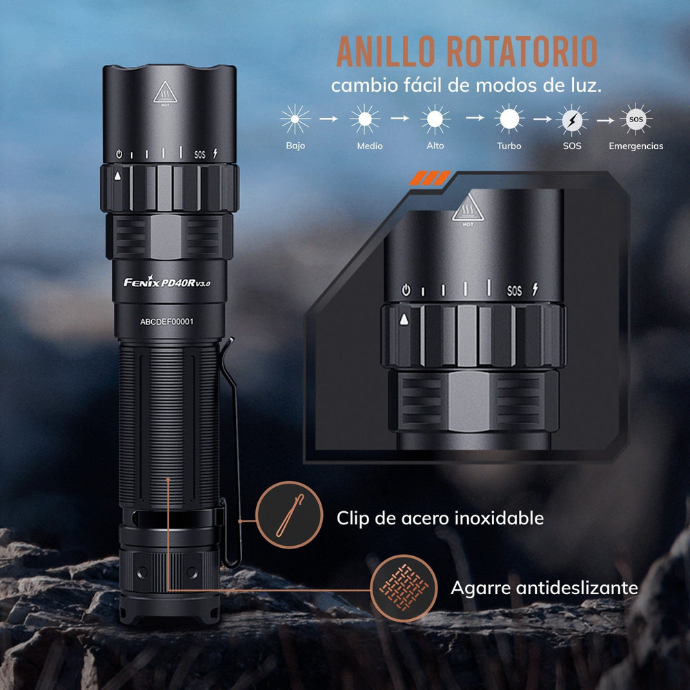 | • El interruptor giratorio mecánico permite cambiar rápidamente entre modos de luz, brindando un control preciso y cómodo con una sola mano en cualquier situación. | ||