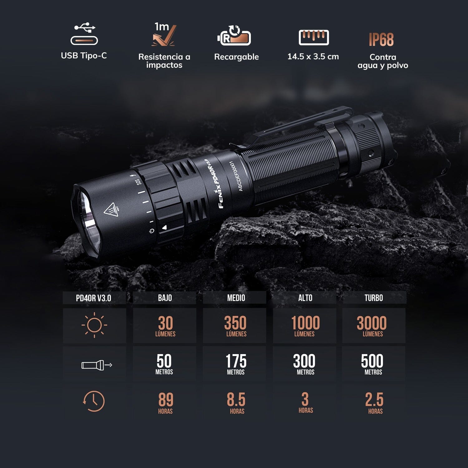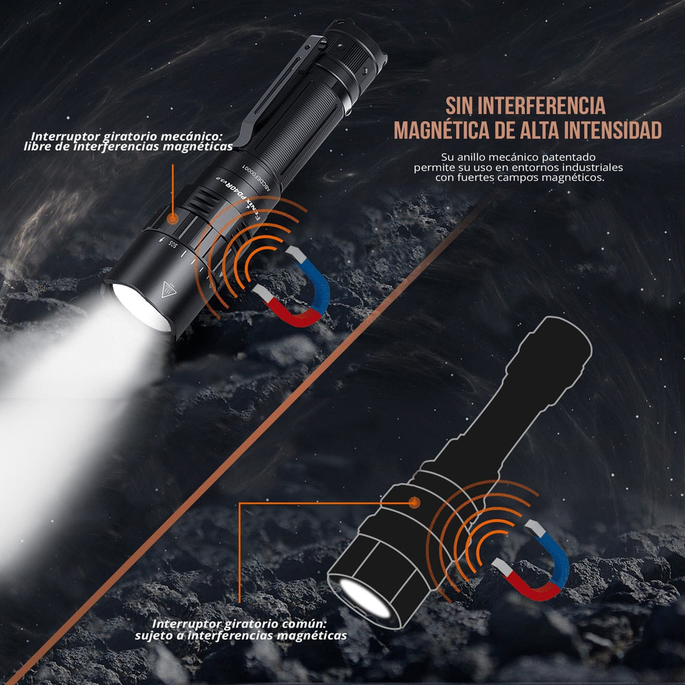 | Ventajas | • Ofrece hasta 3000 lúmenes y un alcance de 500 metros, iluminando grandes distancias con claridad para garantizar seguridad en exploraciones y emergencias en la oscuridad. | |