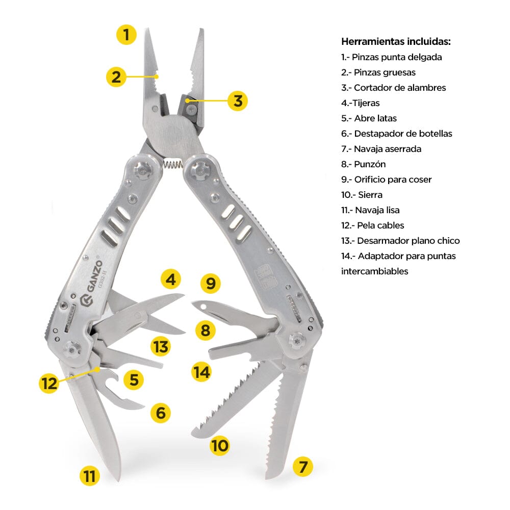 Esta multiherramienta es la elección perfecta para aquellos que buscan la máxima versatilidad y rendimiento. Con una robusta construcción de acero inoxidable, esta herramienta ofrece durabilidad y resistencia excepcionales. Sus 14 funciones, que incluyen alicates, destornilladores, cuchillas y más, la convierten en una solución completa para una variedad de tareas. Especificaciones: Marca GANZO No. de Modelo G302-H Color Plata...